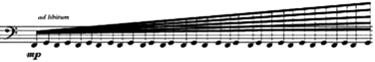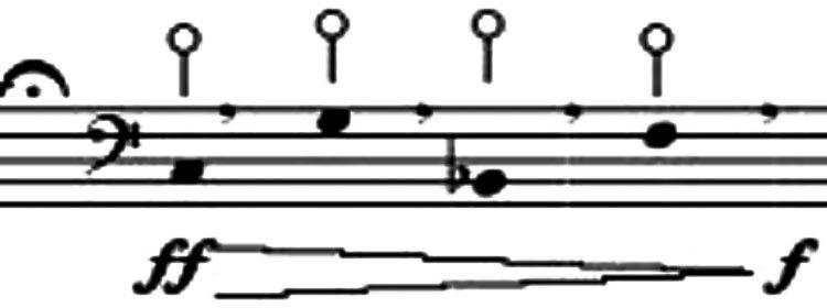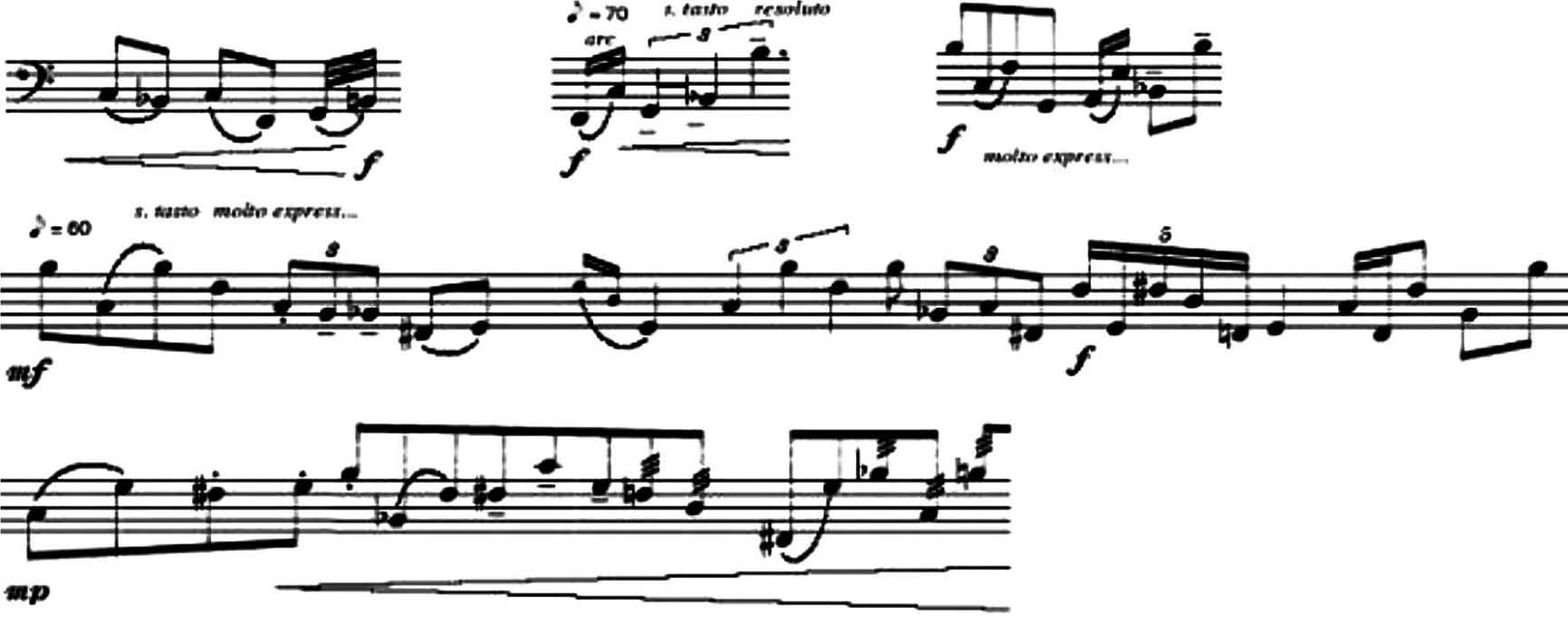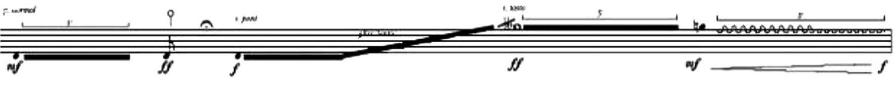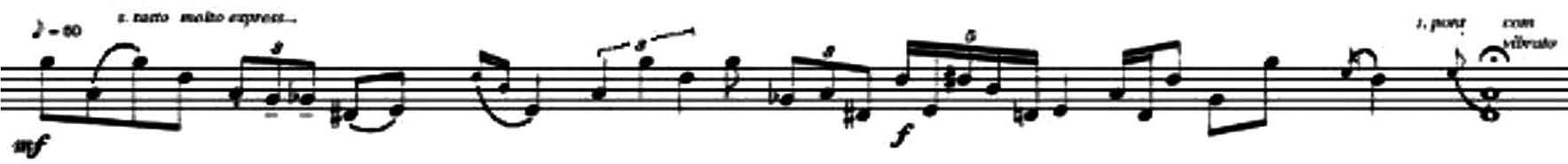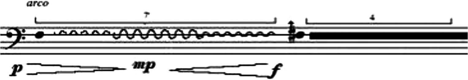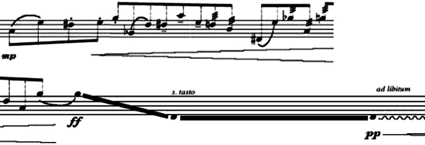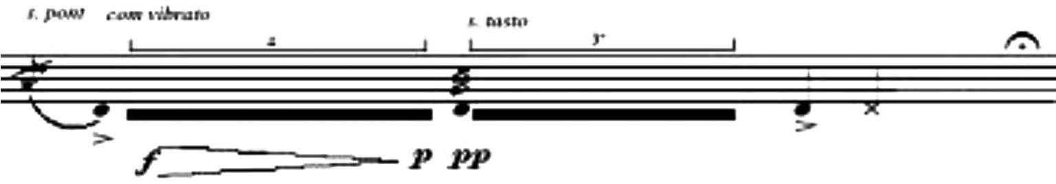 Na terceira linha da segunda página notamos um gesto dramático que é o glissando mais longo da peça (Figura 12): um “Sol” corda solta em pianíssimo, que deve ter um crescendo executado em seis segundos, seguido de um glissando de três oitavas que deve chegar a um Lá em piano súbito. Nesta parte, deve-se planejar o arco cuidadosamente, começando com o Sol para cima; usando pouquíssimo arco em seu início, para que, após quatro segundos, tenhamos arco suficiente para chegar ao fortíssimo e depois sustentar o glissando no arco para baixo, chegando até o piano súbito na ponta do arco.
