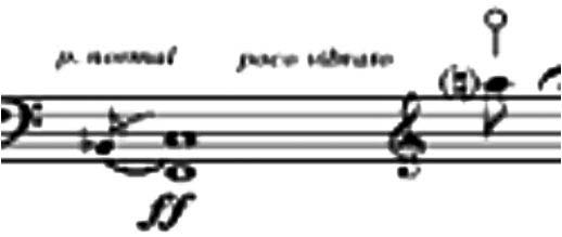 Uma marcação interessante na nota Fá (Figura 15) que se segue é a da amplitude do vibrato, pois no meio da nota, o vibrato desloca-se quase que uma terça. Devido a este fato devemos fazer o dedo efetivamente deslizar entre o Sol e o Mi. Sugerimos que o “Fá” seja executado na corda Sol, com o quarto dedo, para que possamos deslizá-lo mais efetivamente, e, também para que o “Fá sustenido aumentado de quarto de tom”, quando alcançado, tenha uma sonoridade mais aberta ao ser tocado na corda Ré, enfatizando assim o efeito do crescendo entre essas duas notas.
