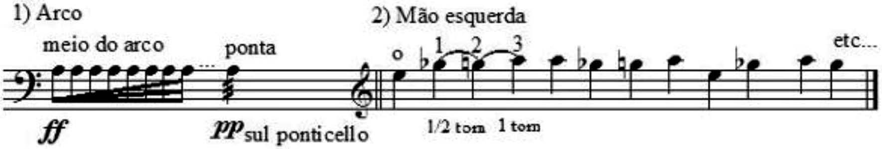 6 Texto original: “[in sulponticello], the more the high harmonics of the note being played become audible... [In sultasto] the bow is actually preventing the string from vibrating freely, reducing the high harmonics.” 7 Texto original: “[in sulponticello], the more the high harmonics of the note being played become audible... [In sultasto] the bow is actually preventing the string from vibrating freely, reducing the high harmonics.”