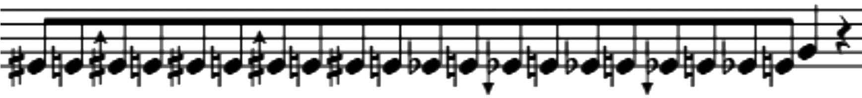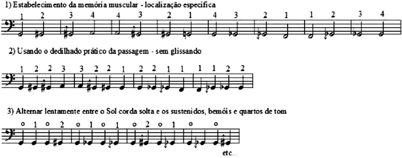 8 Texto original: “Accurate performance of microtones involves a radical departure from centuries of traditional ear-training practices and their mastery requires aunqiue mental discipline, in addition to physical practice.)” 9 De acordo com Stowell (1990, p. 172) Bariolage é um termo que descreve a alternância de notas em cordas adja