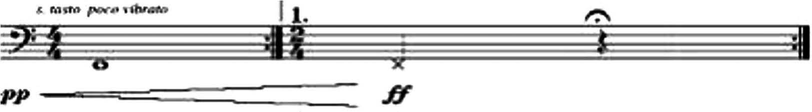 Na terceira linha da segunda página notamos um gesto dramático que é o glissando mais longo da peça (Figura 12): um “Sol” corda solta em pianíssimo, que deve ter um crescendo executado em seis segundos, seguido de um glissando de três oitavas que deve chegar a um Lá em piano súbito. Nesta parte, deve-se planejar o arco cuidadosamente, começando com o Sol para cima; usando pouquíssimo arco em seu início, para que, após quatro segundos, tenhamos arco suficiente para chegar ao fortíssimo e depois sustentar o glissando no arco para baixo, chegando até o piano súbito na ponta do arco.
